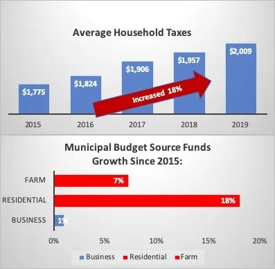 Betty Ann Fort has been Mayor or Deputy Mayor since 2015. Under her leadership the municipal budget has increased 11% and we homeowners are bearing more than our fair share of that. Our portion of the municipal budget has grown 18%, farmers 7%.